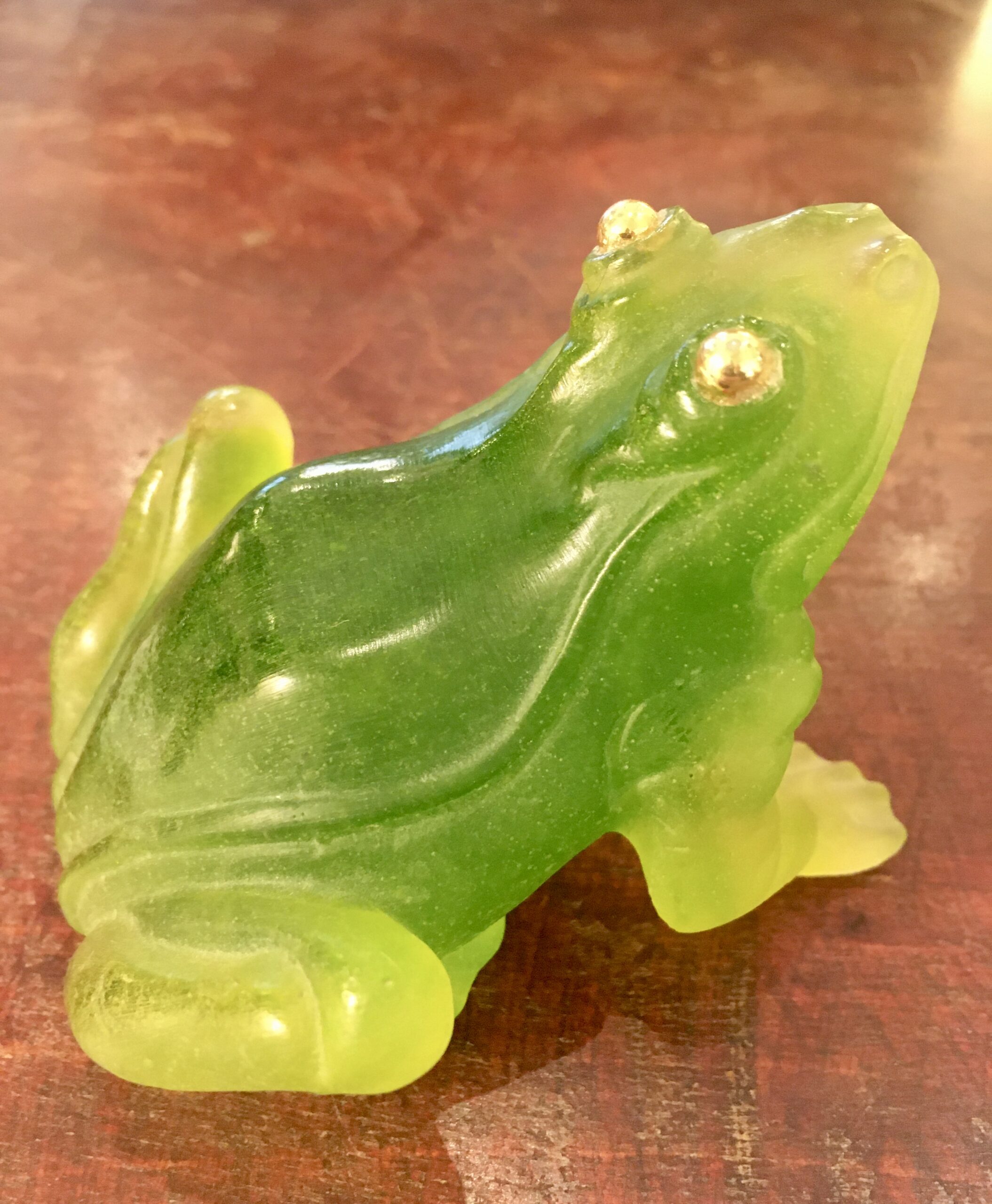 Daum France, green & golden frog, molten glass, 8cm by 6cm high, circa 1970