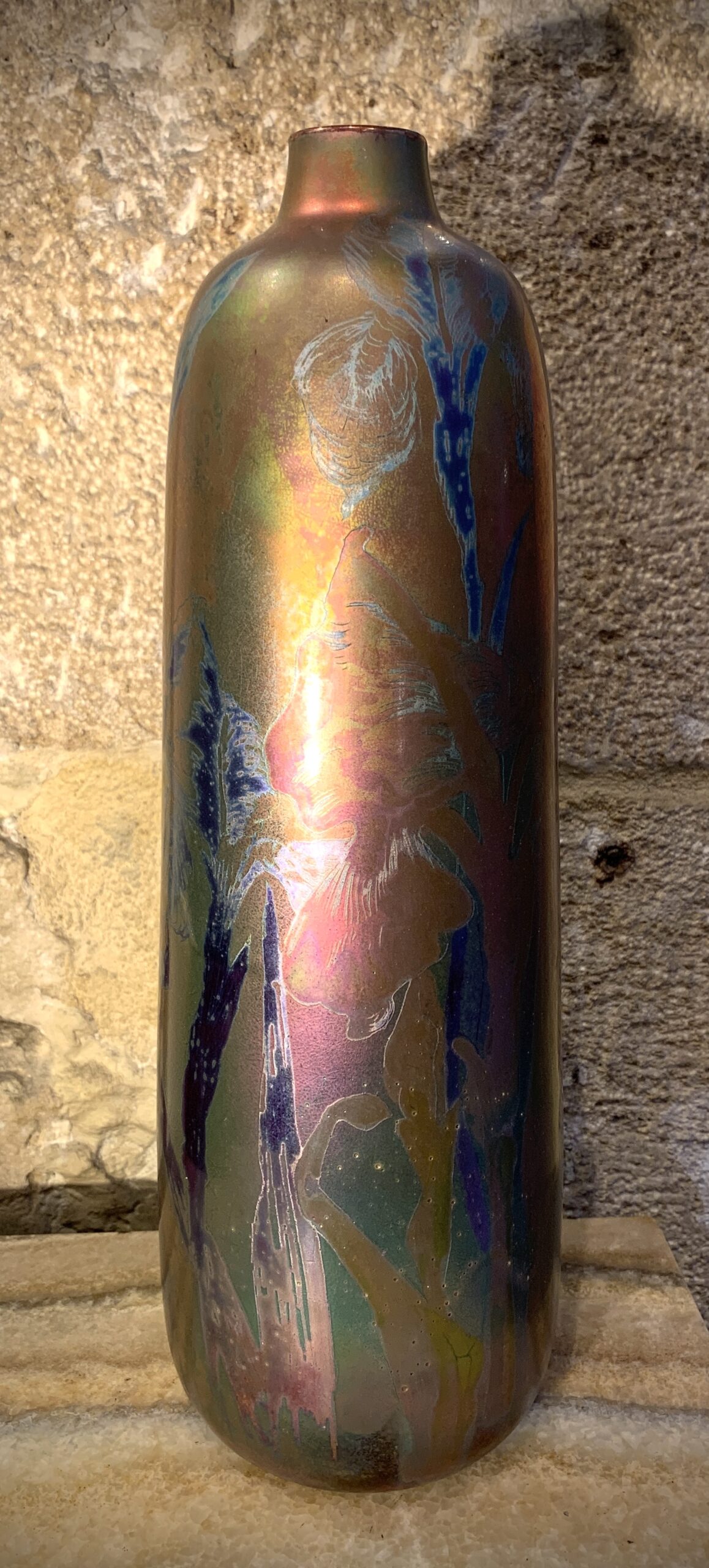 - Clément Massier (1844-1917), huge iridescent iris ceramic vase, 39cm high, circa 1900