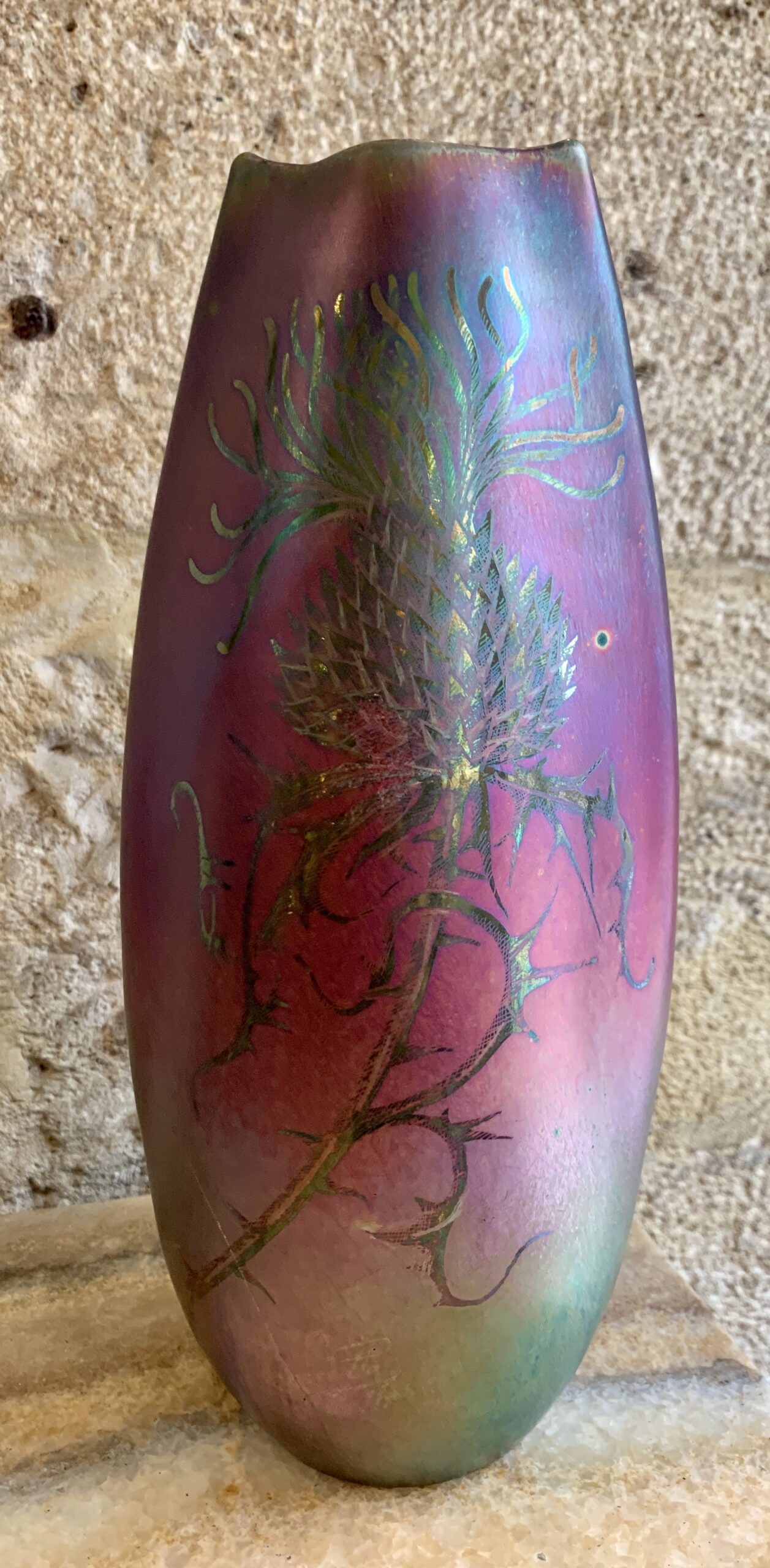 - Jérôme Massier (1850-1926), iridescent ceramic thistle vase, 21cm high, circa 1900