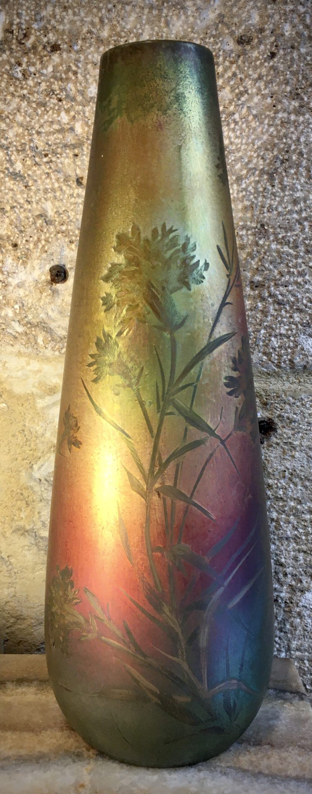 Jérôme Massier (1850-1916), iridescent ceramic flower vase, 34cm high, circa 1900